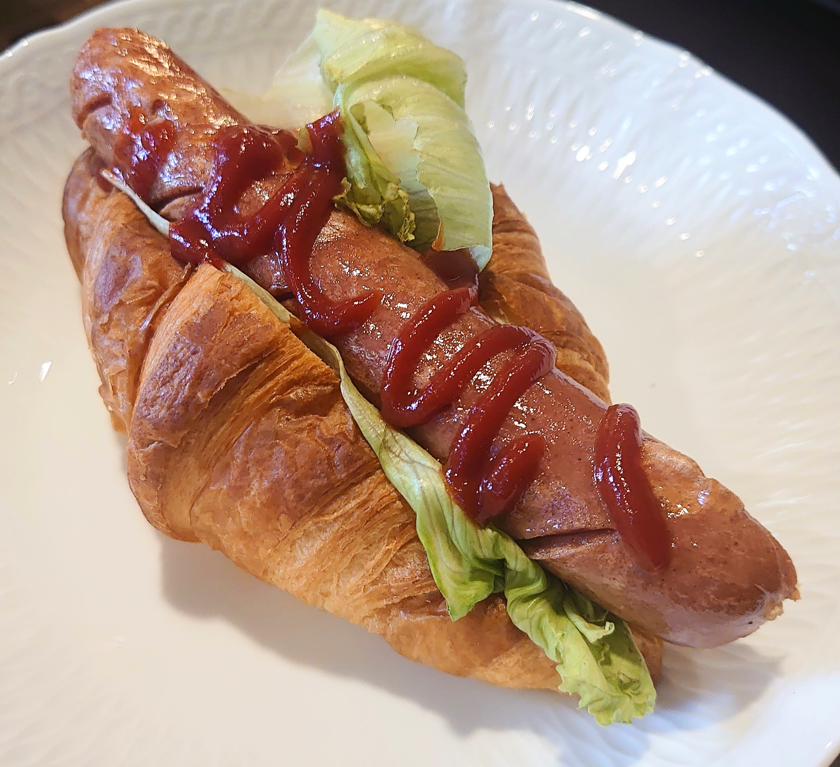 サクサクのクロワッサンに大きなソーセージを乗せました。