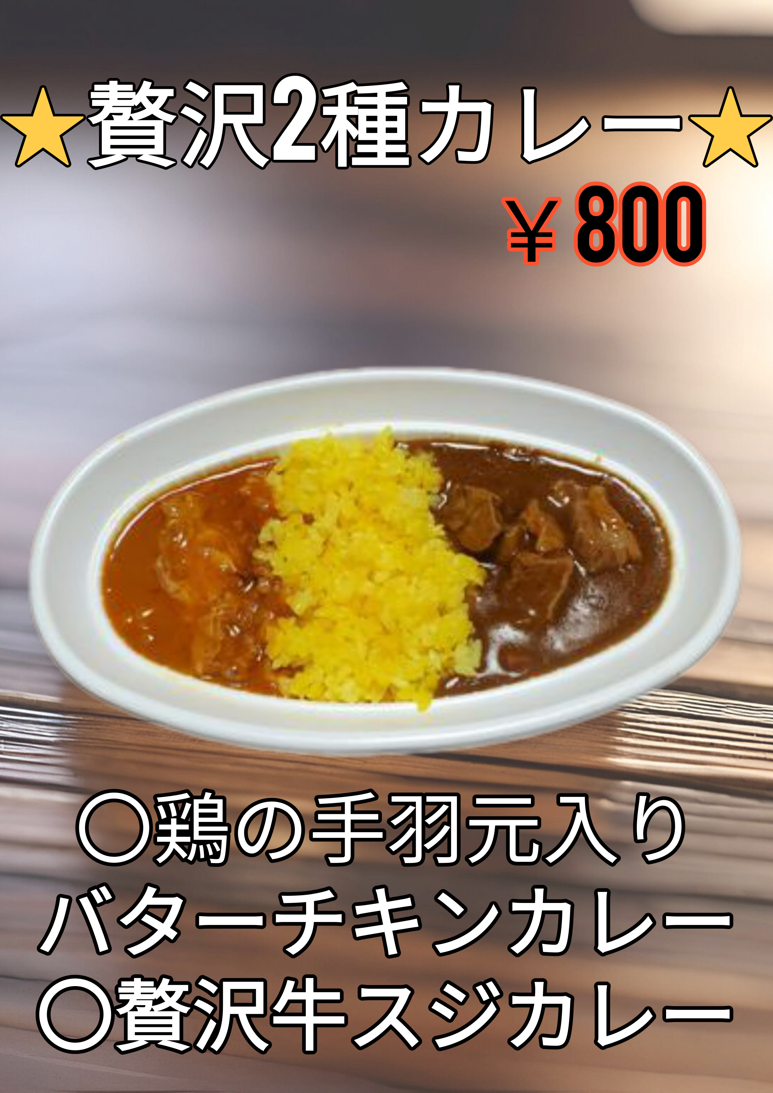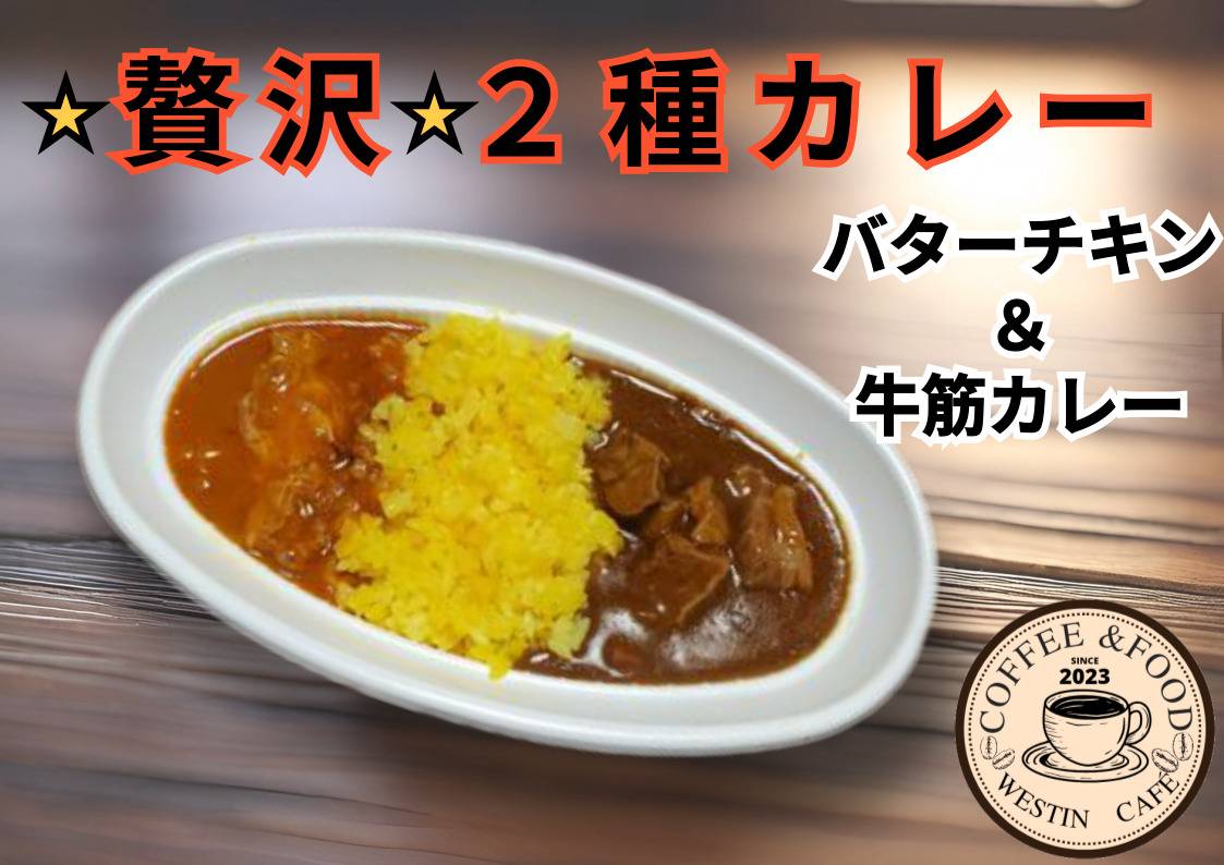 具材にこだわった、当店自慢の、牛スジカレーと、鶏の手羽元骨付きバターチキンカレーの二種類のカレーが味わえます。