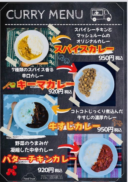 牛すじカレー・バターチキンカレー・キーマカレー・ホロホロチキンカレー・ピタパンキーマ・まかないおいなり・ソフトドリンク・アルコール
