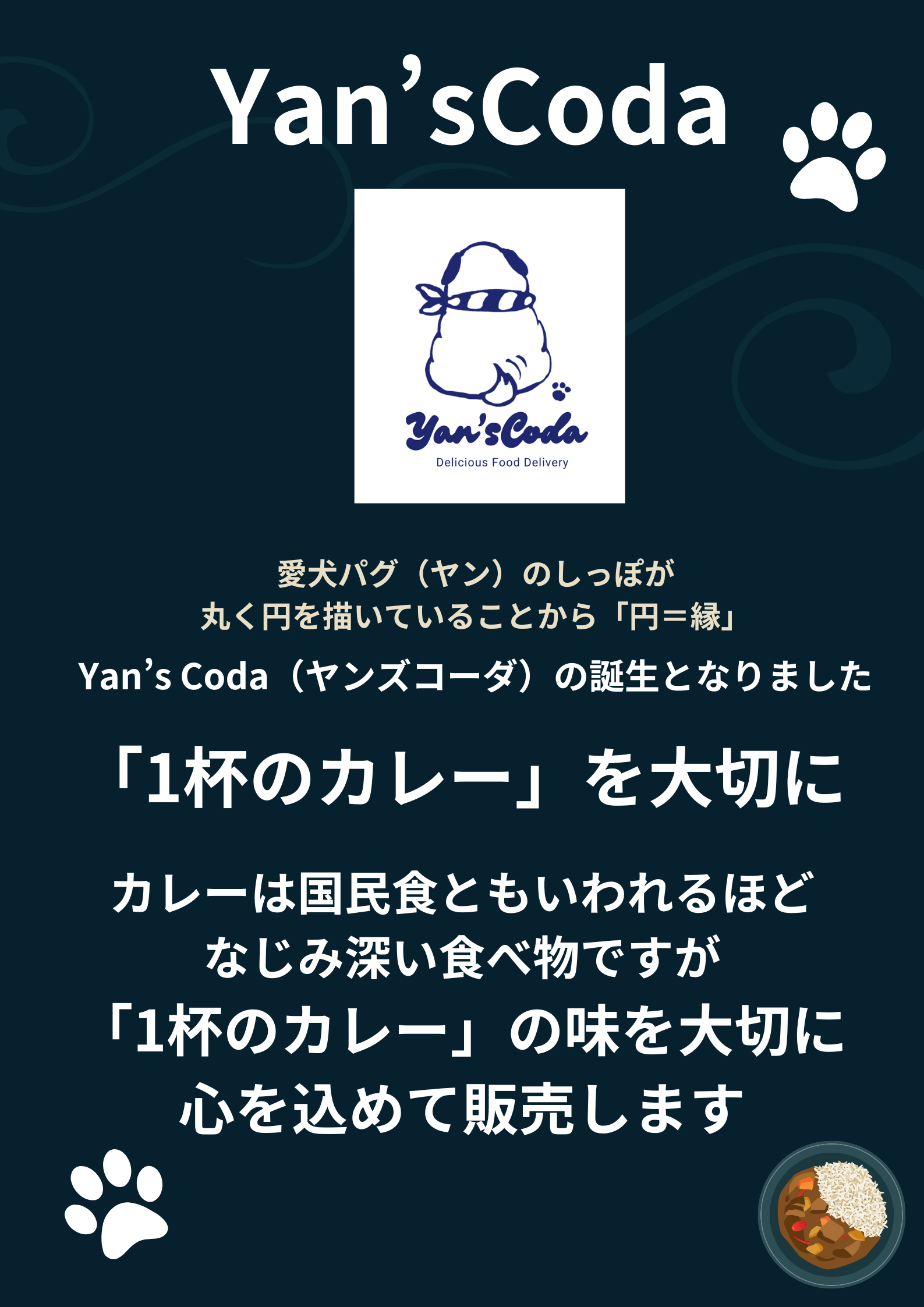 お店のロゴは愛犬パグのヤンです。コーダはイタリア語で尻尾。「ヤンのしっぽ」という意味の店名です。パグのしっぽは丸く円を描いており「円=縁」人との繋がりや出会いなどご縁を大切に、1杯のカレーの味を大切人心を込めて販売することがコンセプトです。