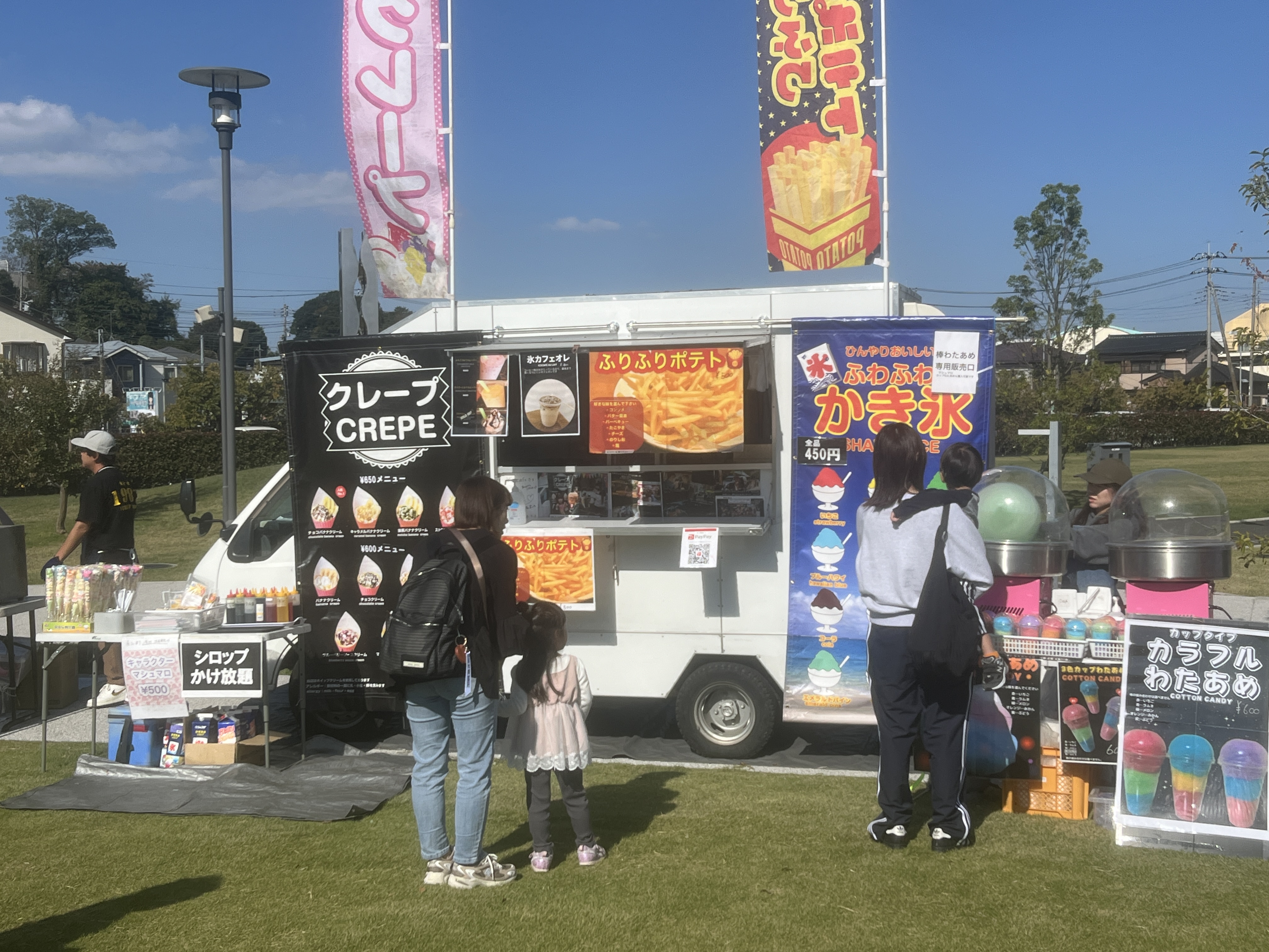 クレープ/かき氷/ドリンク類/わたあめ/ふりふりポテト/ロングポテト/ホットドッグ/焼きそば/牛串/けずりいちご/アイス/からあげ/チュロス/餃子ドッグ/肉巻きおにぎり