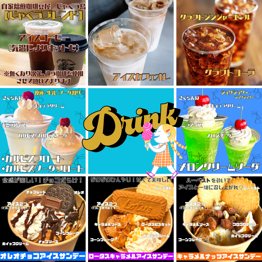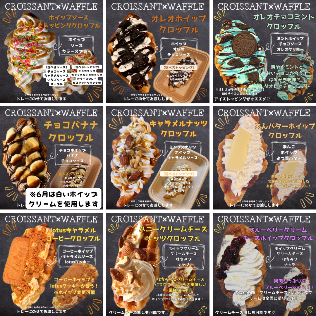 クレープ、コーヒー、ラテ、クロッフル、フルーツコッペ