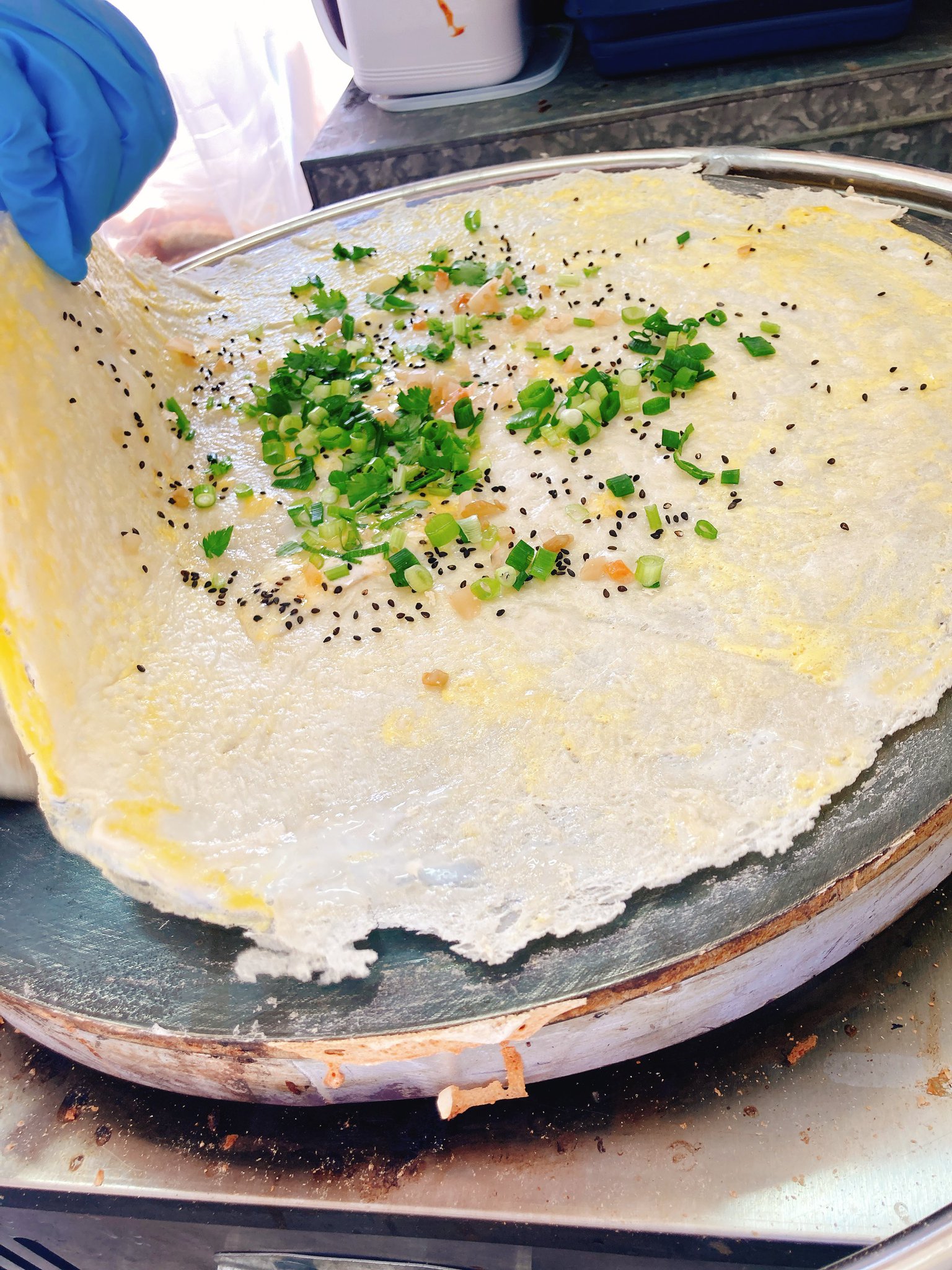 当店主力商品の中華的ガレット「ジェンビン」は直径45センチの鉄板で生地を焼き上げています。多くのお客様から「大きい!」「これで1人前?」といった反応をいただいており、サプライズを与えられる商品となっております。