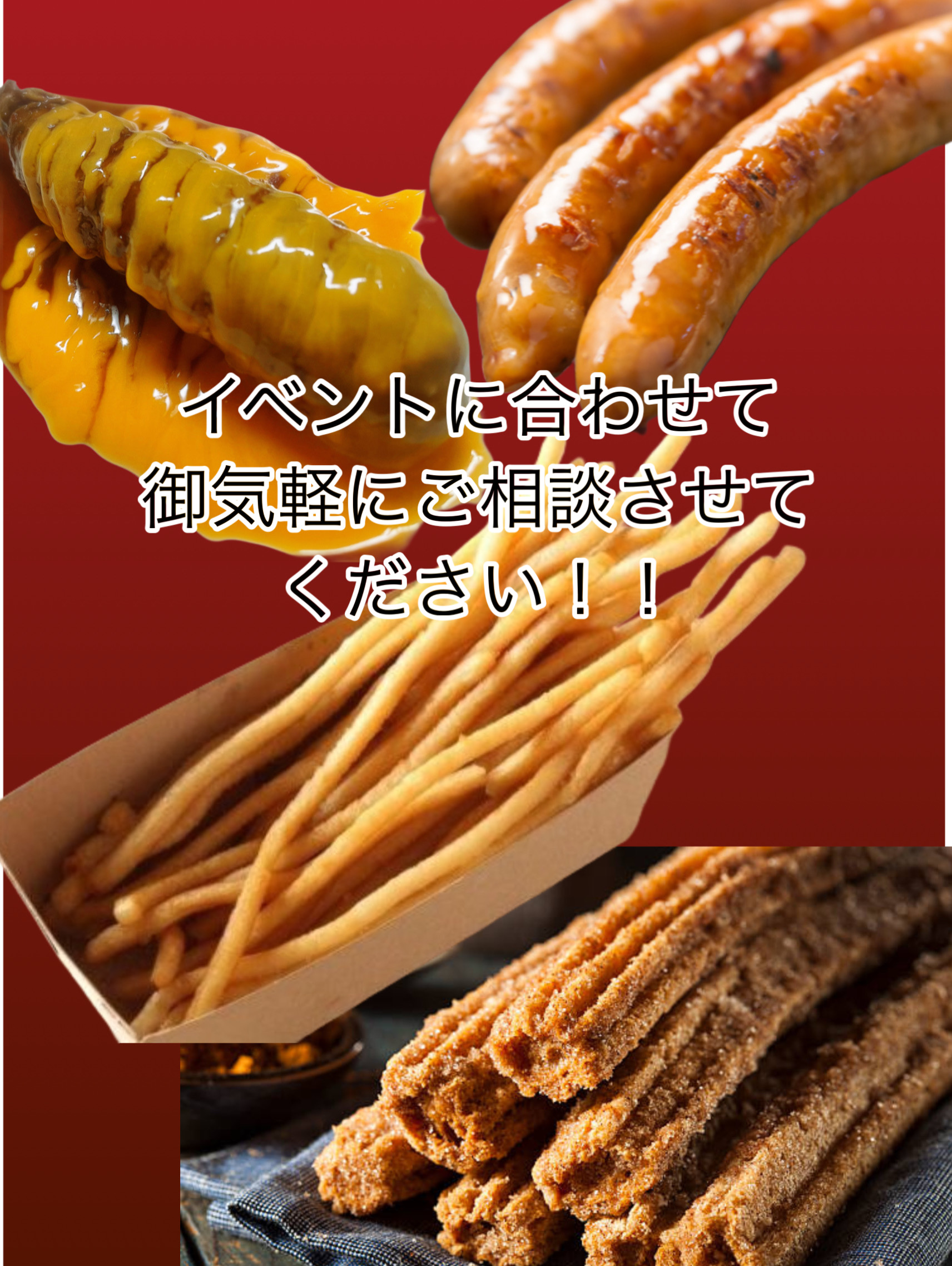 ・肉巻きおにぎりをはじめ、フランクフルト、揚げたてのロングポテト、揚げたてチュロスなど、ワンハンドフードやおつまみ商品を取り揃えております。