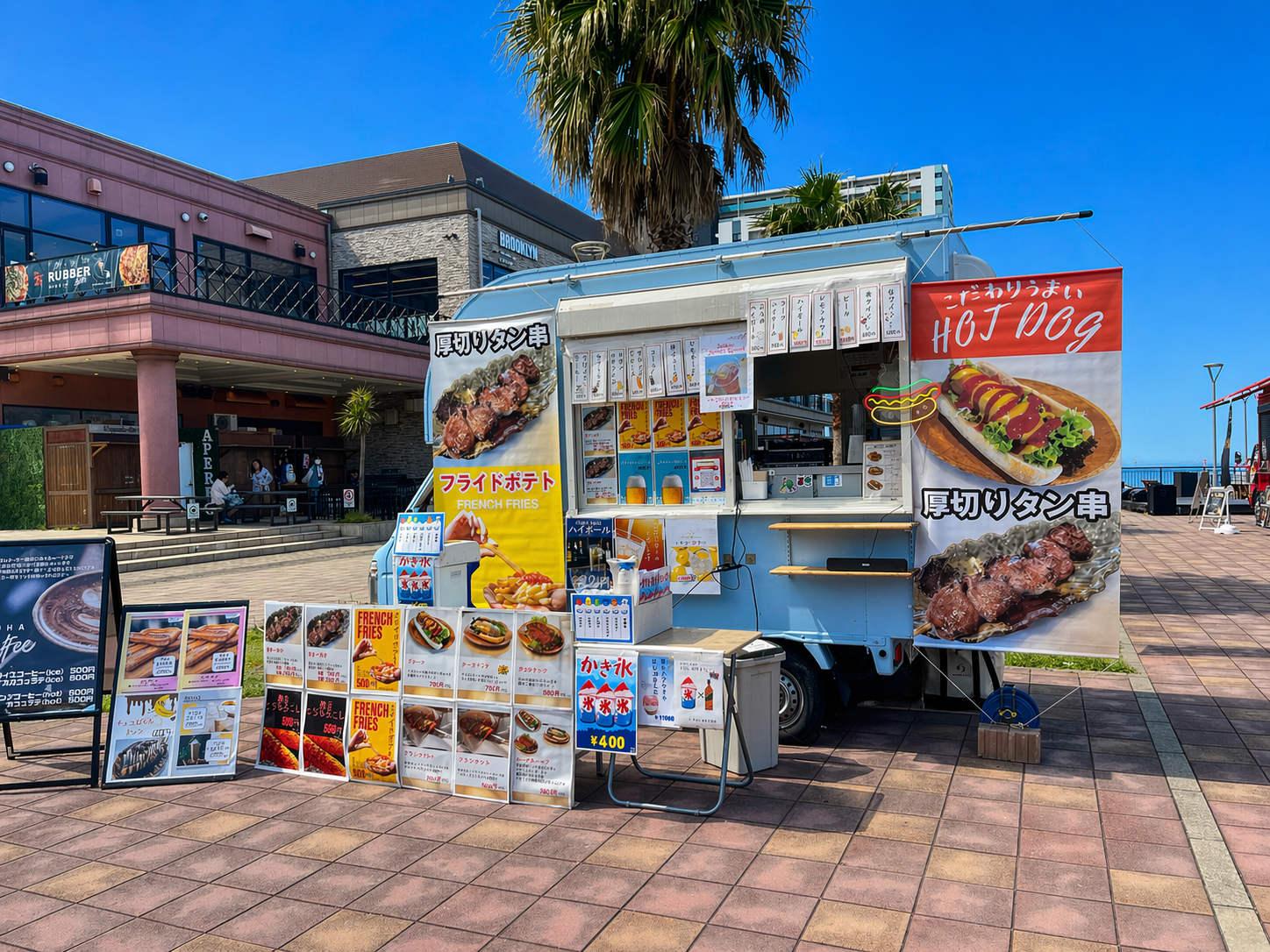 ホットドッグ(プレーン・チーズ・サルサ)、タン串、焼きとうもろこし、フランクフルト、各種ジュース、各種アルコール、かき氷