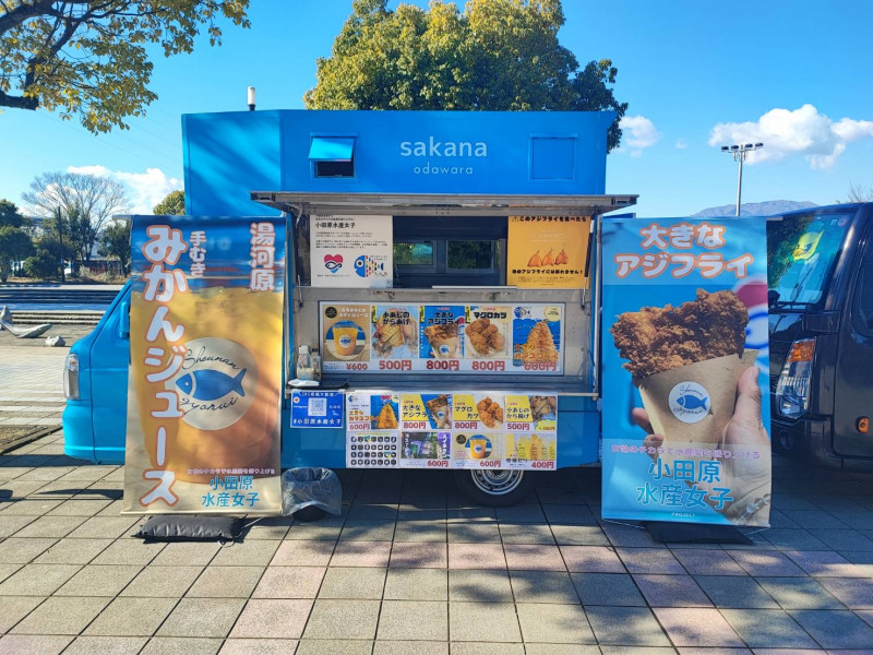 大きなアジフライ、マグロかつ、小あじのから揚げ、湯河原手むきみかんジュース他