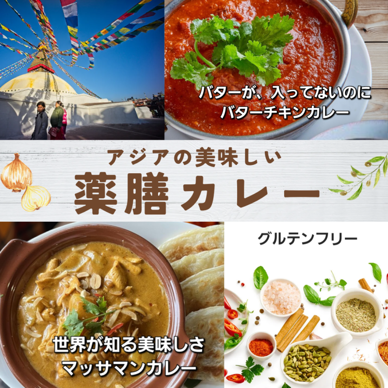 ネパール,薬膳カレー、タイ料理ガパオライス、カオマンガイ、ガイヤーン焼鳥、ドリンク